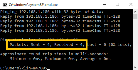 - Verify that all 4 ping replies were received.